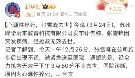 2026年3月24日晚间,知名教育人士张雪峰因心源性猝死,经全力抢救无效,于2026年3月24日15时50分在苏州去世,年仅41周岁。